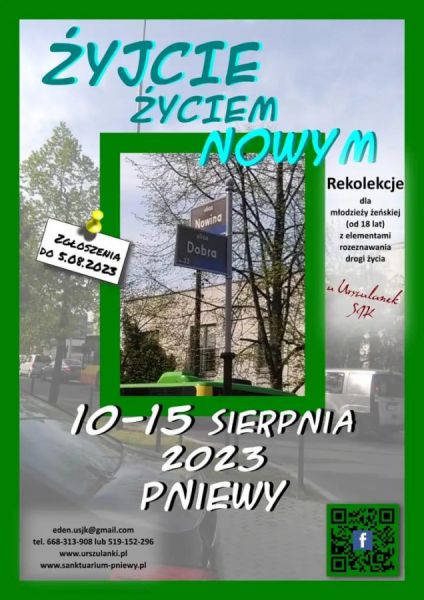 Zapraszamy młodzież żeńską do wzięcia udziału w rekolekcjach z elementami rozeznawania drogi życia pt. „Żyjcie życiem nowym” organizowanych przez siostry Urszulanki Serca Jezusa Konającego dla dziewcząt (od 18 lat) w Pniewach w dniach od 10 do 15 sierpnia 2023 r. Zgłoszenia do 5 sierpnia 2023 r.: