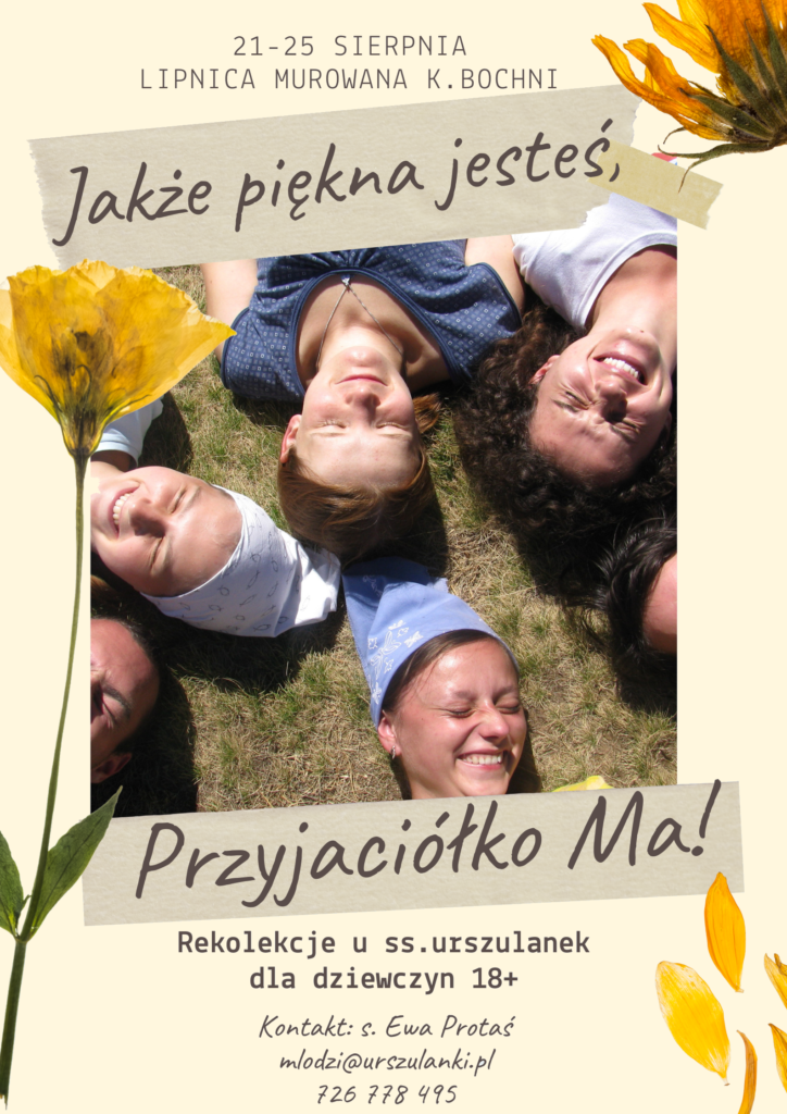 Siostry urszulanki zapraszają również dziewczęta powyżej 18 lat do udziału w rekolekcjach pt. „Jakże piękna jesteś, Przyjaciółko Ma!” w Lipnicy Murowanej k. Bochni w dniach od 21 do 25 sierpnia 2023 r. Kontakt: s. Ewa Protaś – młodzi@urszulanki.pl, tel. 726 778 495.